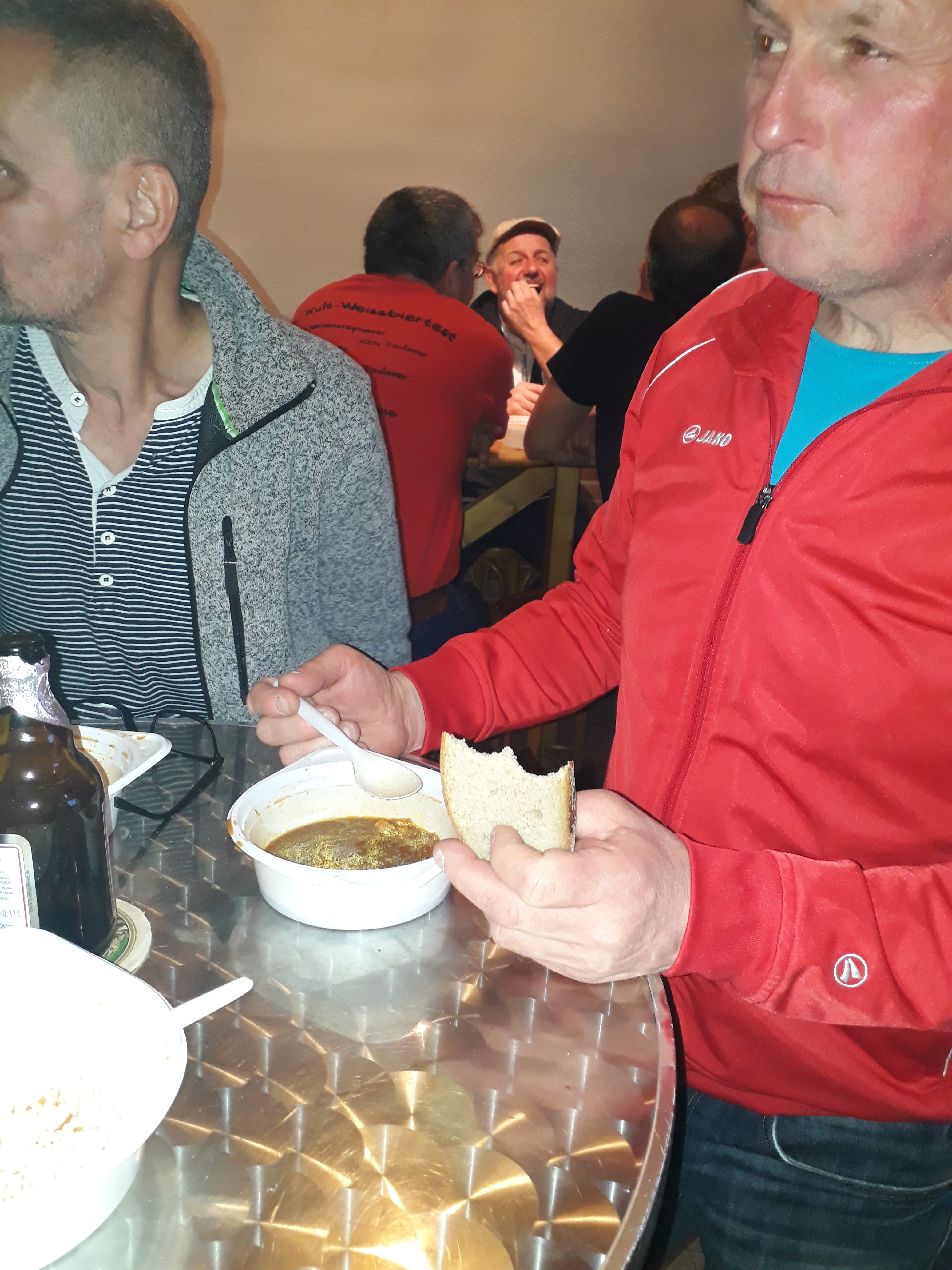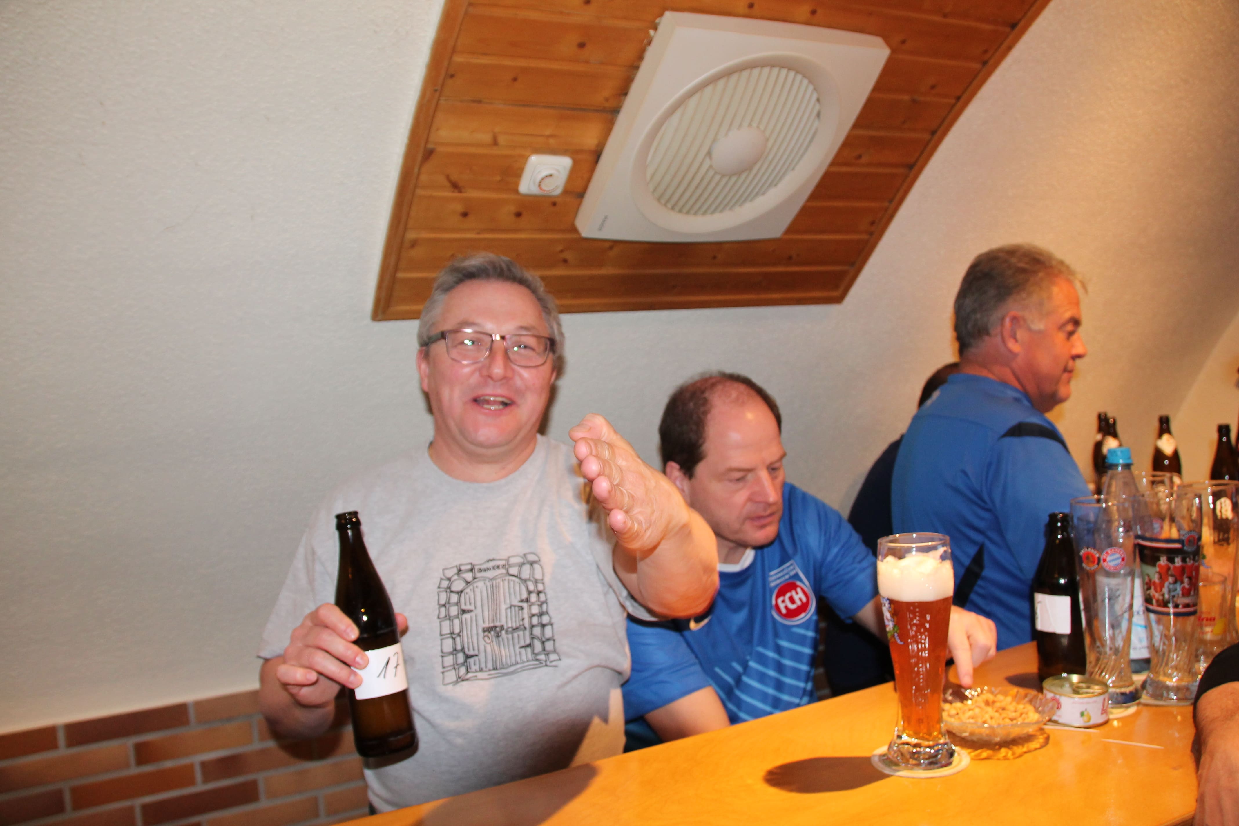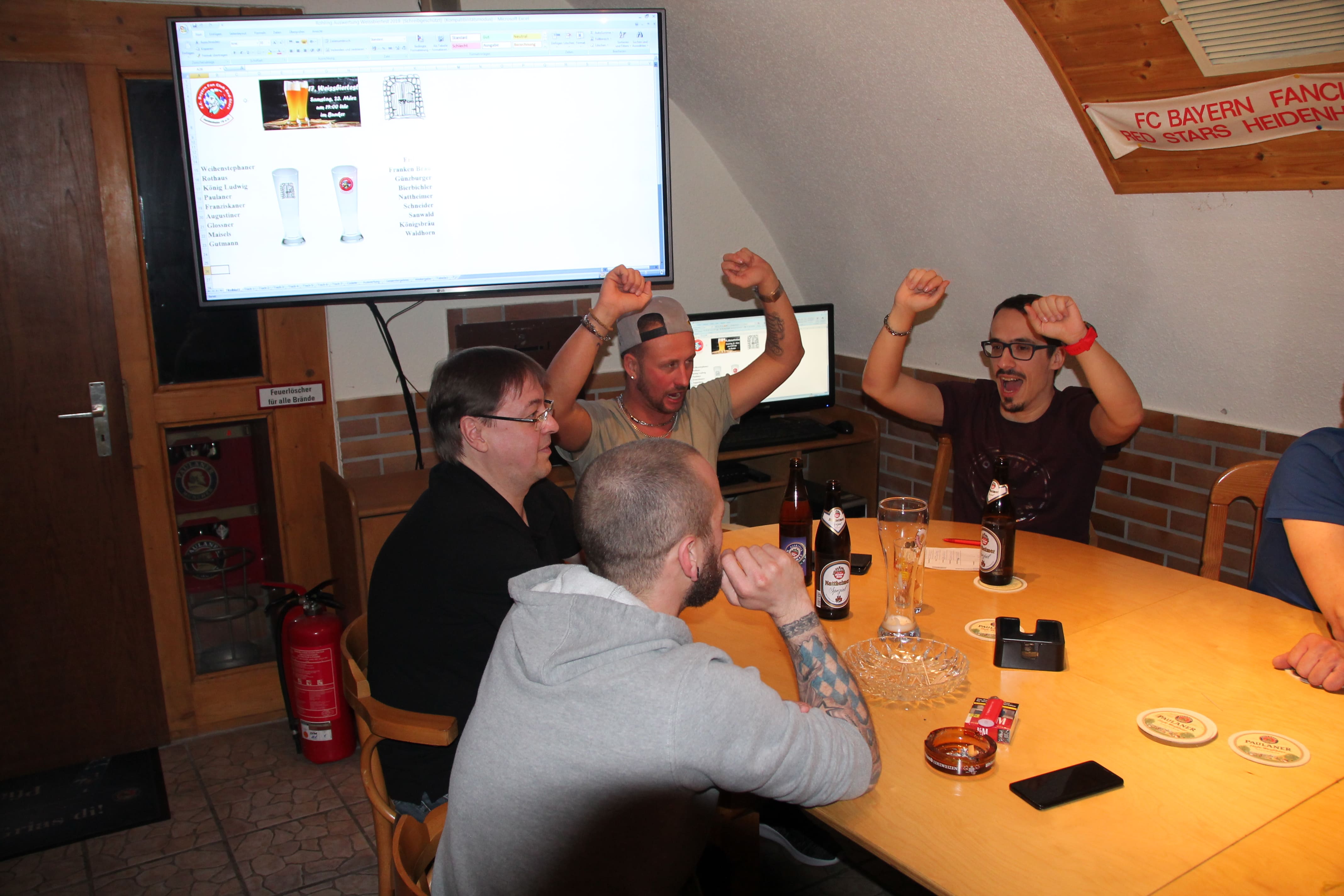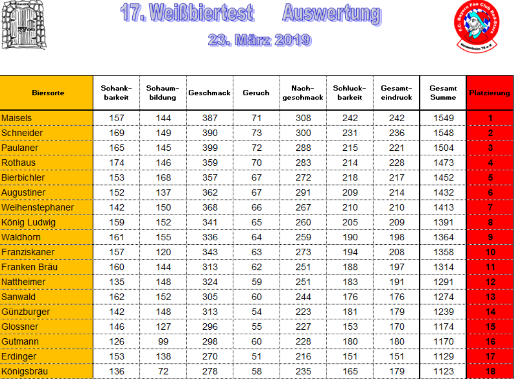 Die Testtrinker teilten sich in fünf 5er und zwei 4er Gruppen auf. Die Stimmung war wie immer sehr ausgelassen und man konnte es kaum erwarten bis das nächste Bier auf die Tische kam. Wie immer wurde es mit dem fast schon legendären „Bier, Bier, Bier, Bier....“ geordert. Es gab wieder reichlich Snacks zwischendurch und in der Halbzeit bekamen wir Gulasch von Bernd Schleicher der Metzgerei unseres Vertrauens. Nachdem 18 verschiedene Weissbiere verkostet und bewertet wurden gab es ein Endergebnis. Maisel`s Weisse setze sich mit dem denkbar knappen Vorsprung von nur einem Punkt vor Schneider Weisse an die Spitze und gewann diesen 17. Weissbiertest mit 1.549 Punkten. Wie schon letztes Jahr belegte das Weissbier von Königsbräu den letzten Platz. Auch nach der Weissbierprobe ging die Party im Bunker weiter. Es wurde noch bis 5 Uhr morgens mit kühlen Erfrischungsgetränken und Musik gefeiert. Der 17. Weissbiertest war also wieder ein voller Erfolg und wir freuen uns jetzt schon auf Nummer 18. Ein besonderer Dank an dieser Stelle an unser Organisations - und Bedienungsteam hinter der Theke, Dennis Stampf und Johann Schuster. Ebenfalls ein großes Danke an Mike der zum wiederholten Male die Auswertung und Präsentation in die Hand genommen hat.