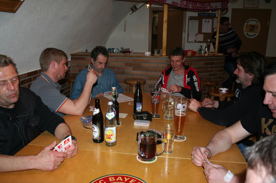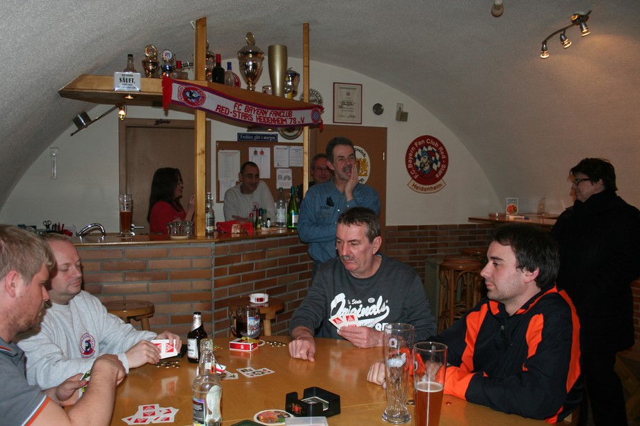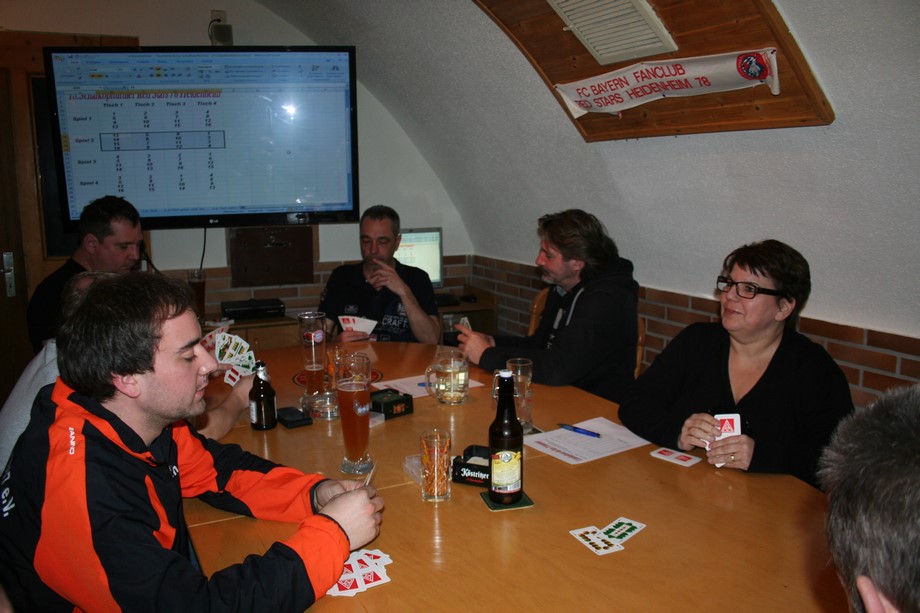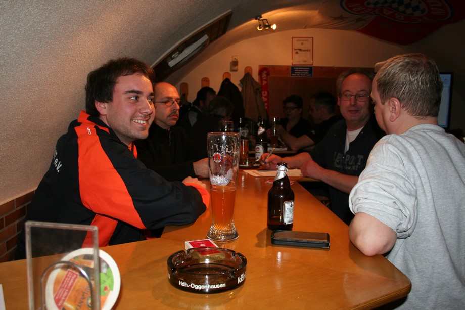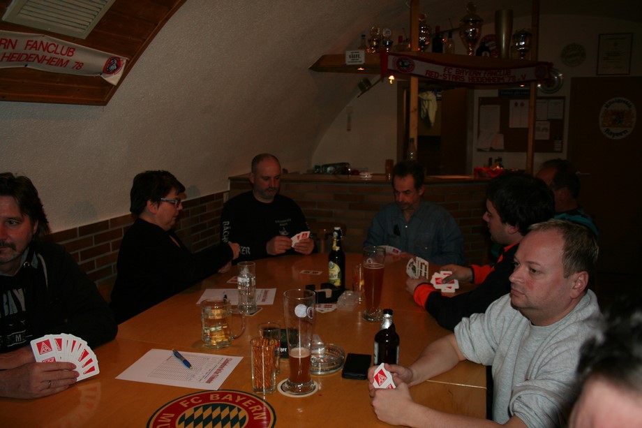 Ein spannendes Turnier bei guter Stimmung zeichnete sich im Laufe des Abends ab. Die Führung wechselte, Jens übernahm von Falter, dahinter war es eng. Nach einer Toprunde an Tisch 3 im letzten Durchgang wurde es immer spannender... Deige mit Tagesrekord (1130 Punkte) konnte letztendlich Jürgen (870 Punkte) nicht mehr von Platz Eins verdrängen. Die Siegerehrung, es war schon 1.45 Uhr, viel relativ kurz aus. Einmal mehr bestätigte sich die Aussage, das nicht nur Können und Glück vonnöten, sondern auch gute Karten entscheidend sind.