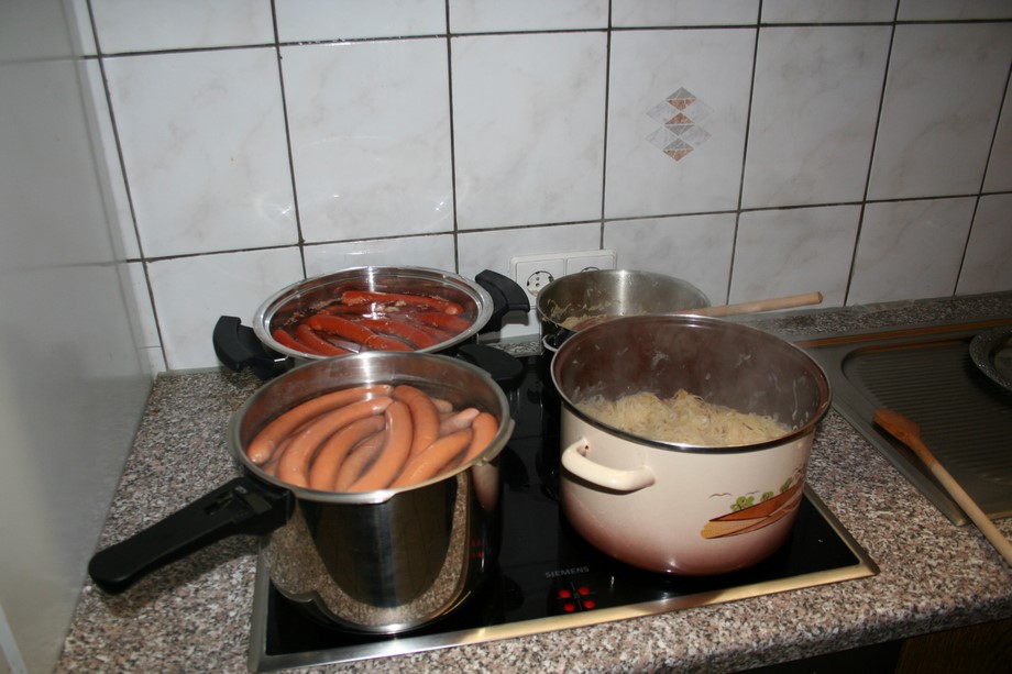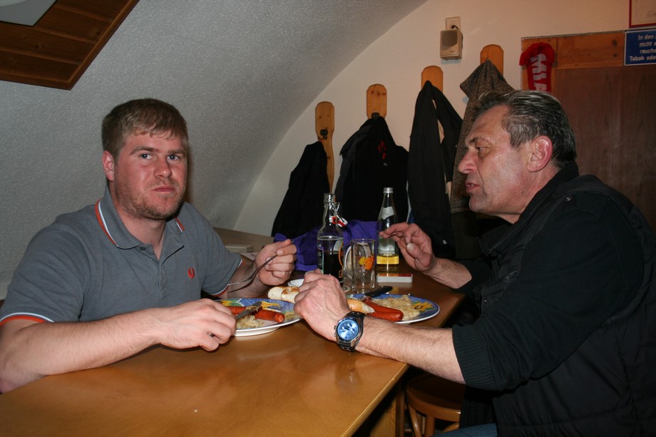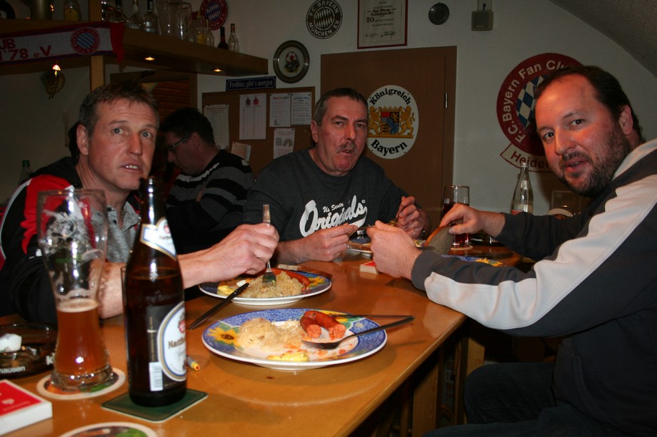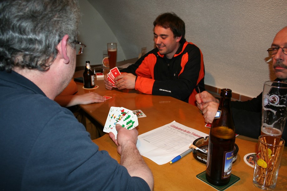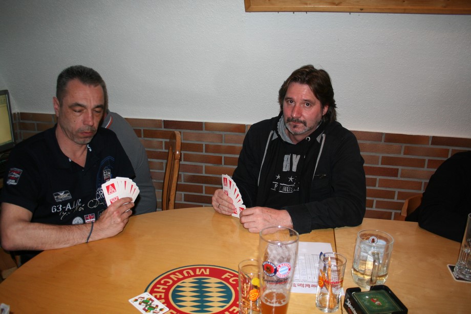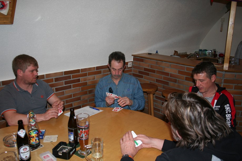 4 Runden a 20 Spiele verlangte der Spielplan. Um 19.45 Uhr, war es dann soweit, jeweils 32 Karten wurden gemischt. Gabi und Wegga verrichteten gute Arbeit und servierten zwischen Runde 2 und 3, da war es schon nach 22 Uhr, Würste mit Kraut und Brot.