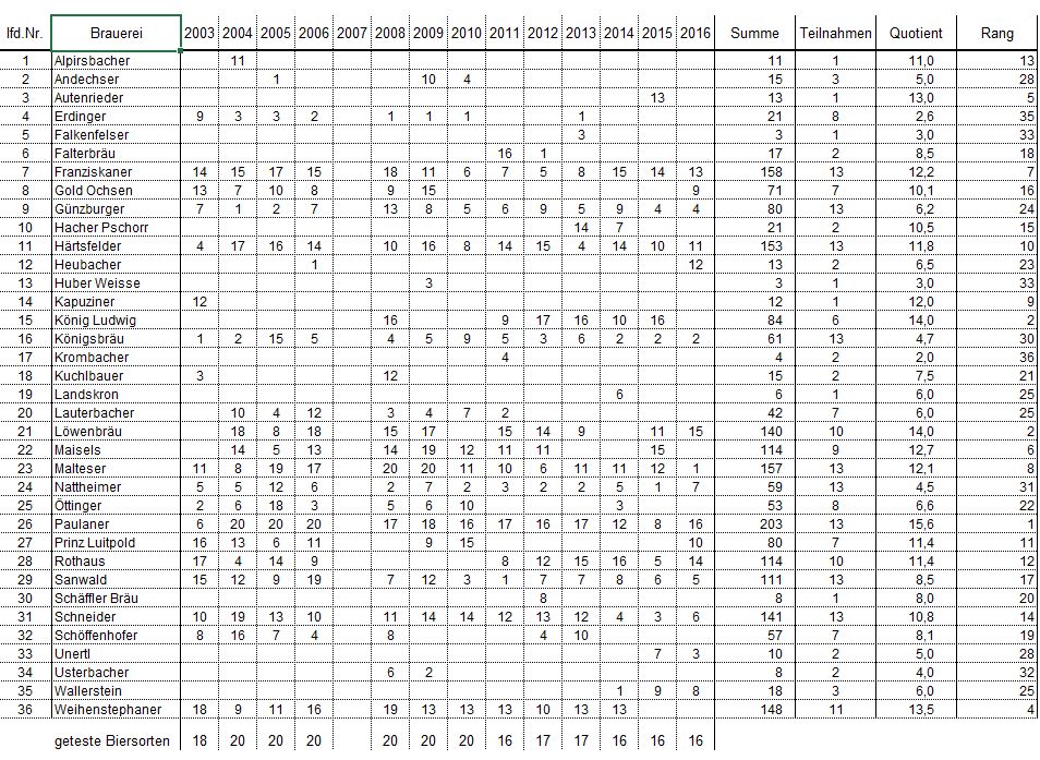 18 Biersorten wurden nach 7 Kriterien bei bester Stimmung getestet und bewertet. Mittendrin erfolgte ein Dankeschön an Jürgen und Fandi für ihren anspruchsvollen Dienst hinter der Theke und in der Küche. Uwe Fink der neben Falter bei allen Tests mit dabei war und natürlich Mike Stude der wie immer die ganze Auswertung und Präsentation bestens organisierte. Auch Promi gehört ein Dankeschön, der im Vorfeld bei den Arbeiten mit den Etiketten dieses Jahr besonders gefordert war. 97 verschiedene Teilnehmer testeten während der letzten 15 Jahre 38 verschiedene Biere, wobei die Nummer 1 das Paulaner, gefolgt von Löwenbräu und König Ludwig, dieses Mal nur auf Platz 5 landete. Platz 4 ging an Löwenbräu, Dritter wurde Weihenstephaner, Gesamtvierter vor Rothaus. Gesamt 12. und überraschend Sieger wurde Franziskaner, das in der Gesamtwertung auf Rang 7 steht. Euch allen vielen Dank! ihr seid es die dieses Highlight geprägt habt.
