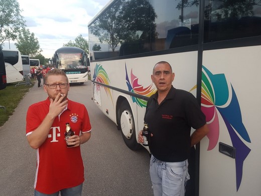 Ein Videobeweis sorgte dann für das 3-0, als der Gefaulte selbst zum Elfer antrat und in gekonnt Klassischer Manier das Leder im Tor versengte. Die wenigen Meter im leichten Regen nur ein Abklatsch dessen was noch 1 Std. davor geschehen. Zwar war der Busparkplatz Mitte bei Ankunft belegt, dafür hatten wir im Süden richtig Massel, der Ordnungsdienst hatte uns nicht wahrgenommen. Dadurch standen wir als zweiter Bus in der Reihe. Ja genau das passiert wenn die Fahrgäste mit Feuchtem Textil in den Bus steigen! die Scheiben beschlagen. Als die "Meldung wir sind komplett" im Fond ankam, ging es ganz schnell, im Bus davor war genau just auch Vollzug, die Rädern rollten, Halt da fehlt noch jemand! Doch jetzt gab es kein Halten mehr, der Verkehr rollt, zum Glück ging es nur im Schritt. Schu hatte so seine Mühe die Frontscheibe einigermaßen auf Sicht zu bekommen, eigentlich Unverantwortlich als Fahrer, eines so unhandliches Fahrzeug im Blindflug durch das Nadelöhr einer so Katastrophalen Ausfahrt zu steuern. Dank moderner Kommunikation gelang es die vermissten in wenigen Minuten zum Fahrzeug zu lotsen. Daniela und Schu sorgten mit Küchentücher „bewaffnet“ in Aufopferungsvoller Manier, das einigermaßen die Sicht und Sicherheit gewährleistet war. Als dann die Lüftung durch mehrmaliges Drehen ihre Aufgabe gerecht wurde, konnte der Fahrer unter regulären Bedingungen die auf der Hinfahrt so gequälten Fahrgäste deutlich nach 1 Uhr, sicher an ihren Zielen verabschieden. Fazit, ein Erlebnis was man sich vielleicht so nicht wünscht, aber ein Happy End war es allemal. Freuen wir uns auf viele weitere Erlebnisse bei Veranstaltungen im Namen der Red Stars 78 Heidenheim e.V.
