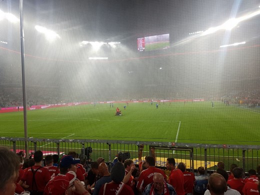 Als dann der Schiedsrichter denn Ball für die 55. Bundesligasaison freigab, war die Stimmung das Kribbeln ja eine Begeisterung im Rund der Allianz Arena deutlich spürbar. 2 Neuzugänge sorgten schnell für die Beruhigende 2-0 Führung. Ja und dann zeigte einmal mehr die Natur ihre unbändige Gewalt auf. Ein Sturm tobte über der Arena, die Böen peitschten den Regen unter das Dach wie noch nie in der Arena gesehen. Die Zuschauer auf der Gegentribüne verließen komplett den Unterrang. Mit 15 Minuten Verspätung ging es in die zweiten 45 Minuten. Das Leverkusen nicht zum Betriebsausflug nach München angereist war, um die Punkte zu verschenken, hat sie dann deutlich bewiesen. Nur schade die Stimmung hatte unter dem Sturm heftigst gelitten, in der Südkurve war die Leidenschaft ungebremst.